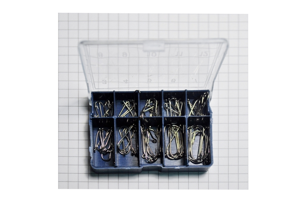 Крючки в синей коробке. Крючки, одна из главных составляющих рыболовного комплекта. Служит для насадки приманки и зацепа рыбы при подсечке.